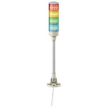 This product is part of the Easy Harmony XVG range, an offer of ? 60mm monolithic tower lights. It is a complete pre-wired and pre-assembled monolithic tower light. It comes with red, amber, green and blue steady light. It offers configurable color combinations and has a base with an integrated buzzer. This tower light has a 24V AC/DC rating. This tower light has a sound rating of 85 dB. It has an aluminum tube and weighs 0.45 kg. It is an IP40 rated product and comes with CE and EAC certification. It has a foldable bracket attached to the tube to fold tower light horizontally for easy transportation and has a pre-assembled cable for easy installation. It provides a more reliable and clear view due to the clear lens. This range offers wide range of voltage selection and flexible mounting options with visual and audible functions.